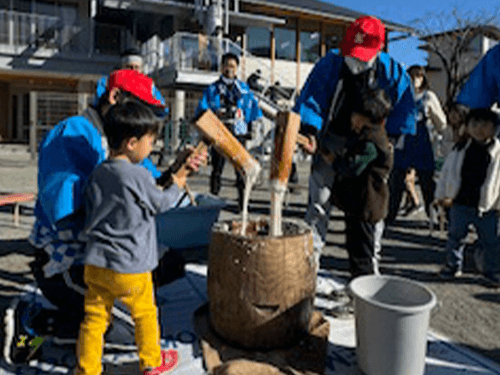 お父様方の力でぺったん、ぺったん。お母様方がおいしいお団子を作ってくださいます。