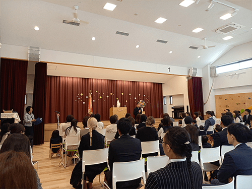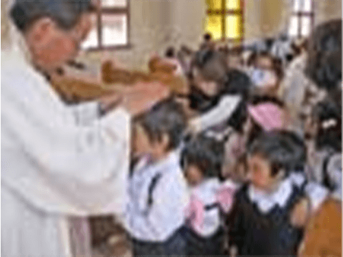 これまでの成長を感謝して聖堂で神父様から祝福をいただきます。