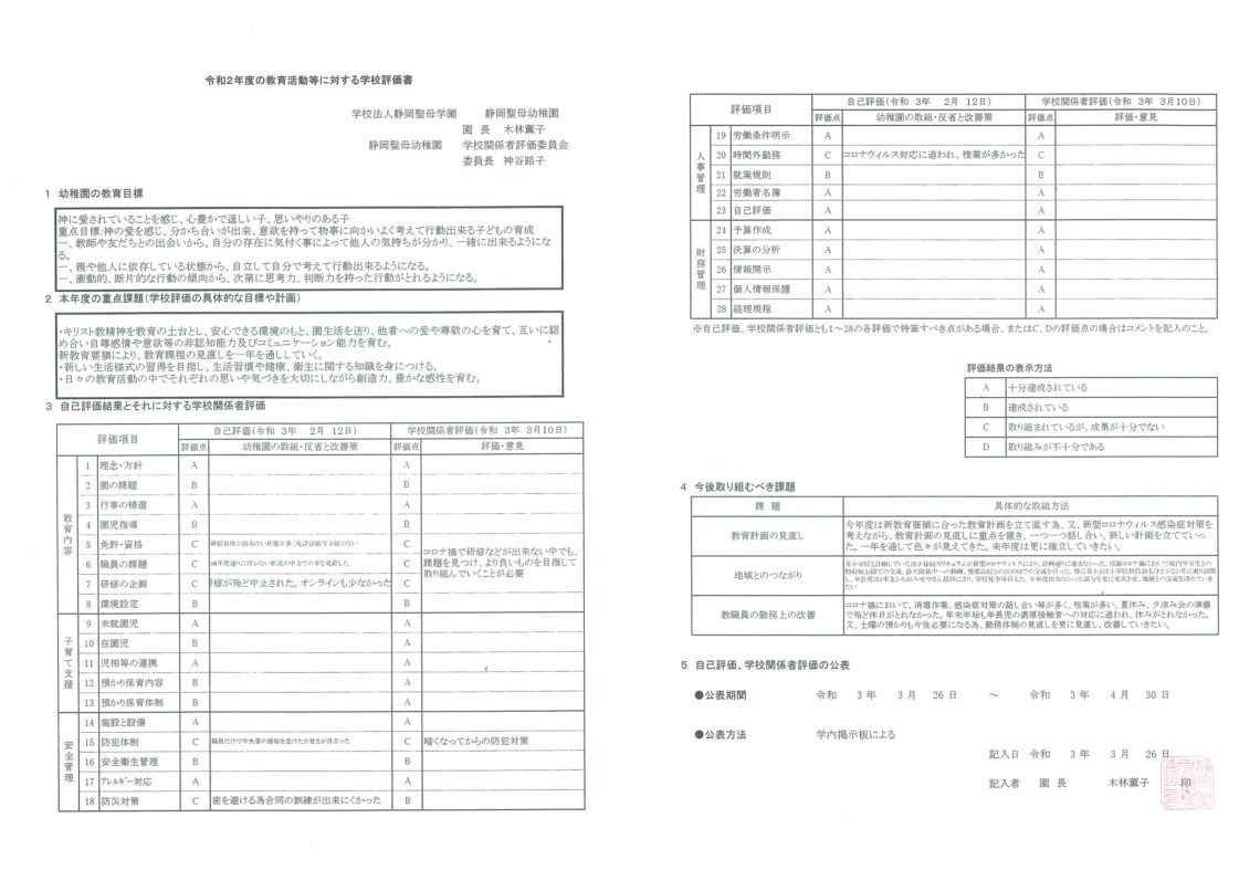 令和2年度静岡聖母幼稚園学校関係者評価 2021.03.26 令和2年度静岡聖母幼稚園学校関係者評価を5名の評価委員様に話し合っていただきました。今回の反省点を基に来年度も日々子どもたちに丁寧な保育を目指していこうと思います。よろしくお願い致します。