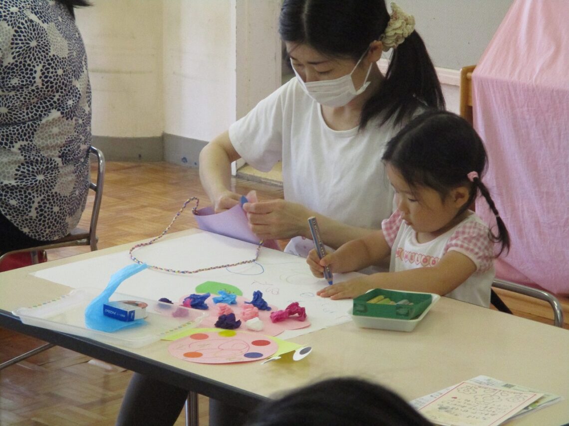 カタツムリとあじさいをお母さんたちと作って側面に貼ります。