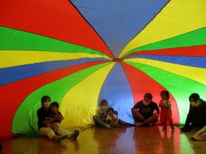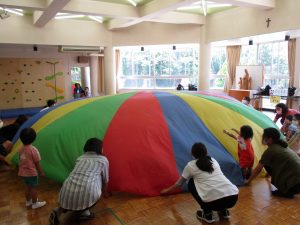 お母さんたちが膨らませたパラバルーンに興味深々の子どもたち!
