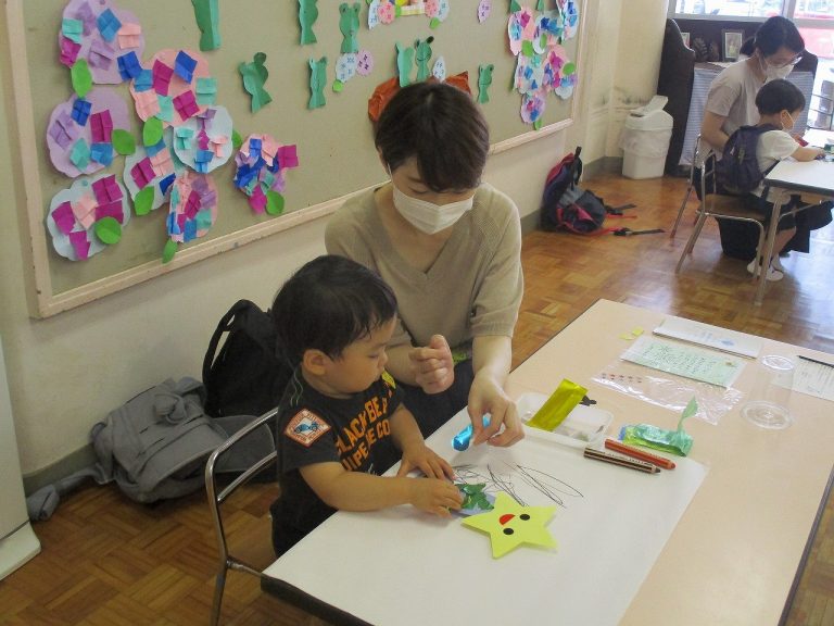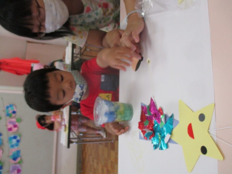 お星さまにちぎった折り紙を貼ったり、透明なコップにスズランテープを割いて入れたりしました。今回の製作では指先を使って素材を破るというとを経験してもらいたいと思い、これらを選びました。