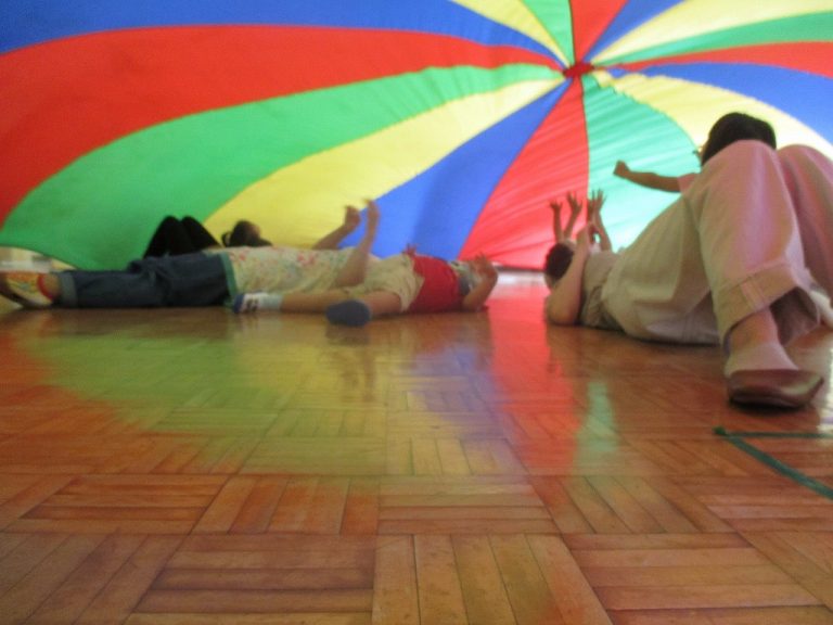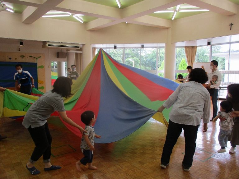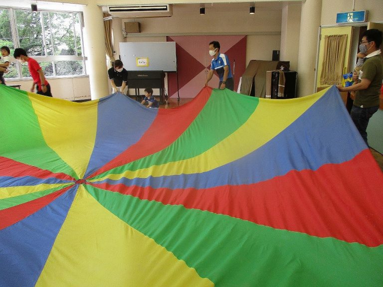中に入って触ってみたり、上下に動かしたり、みんな初めてのパラバルーンに大喜びでした☆