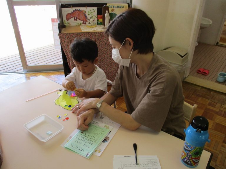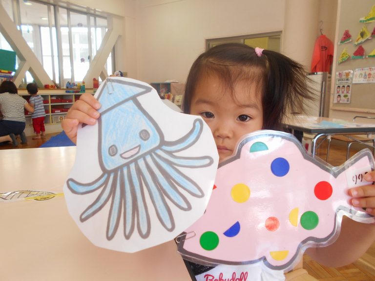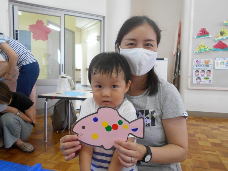 さかな釣り作りでは、シールを思いおもいに貼って素敵なおさかなさんが完成!!
